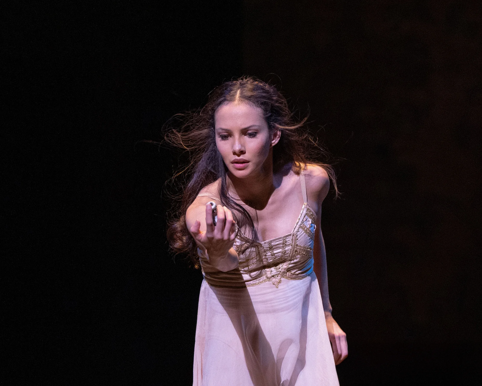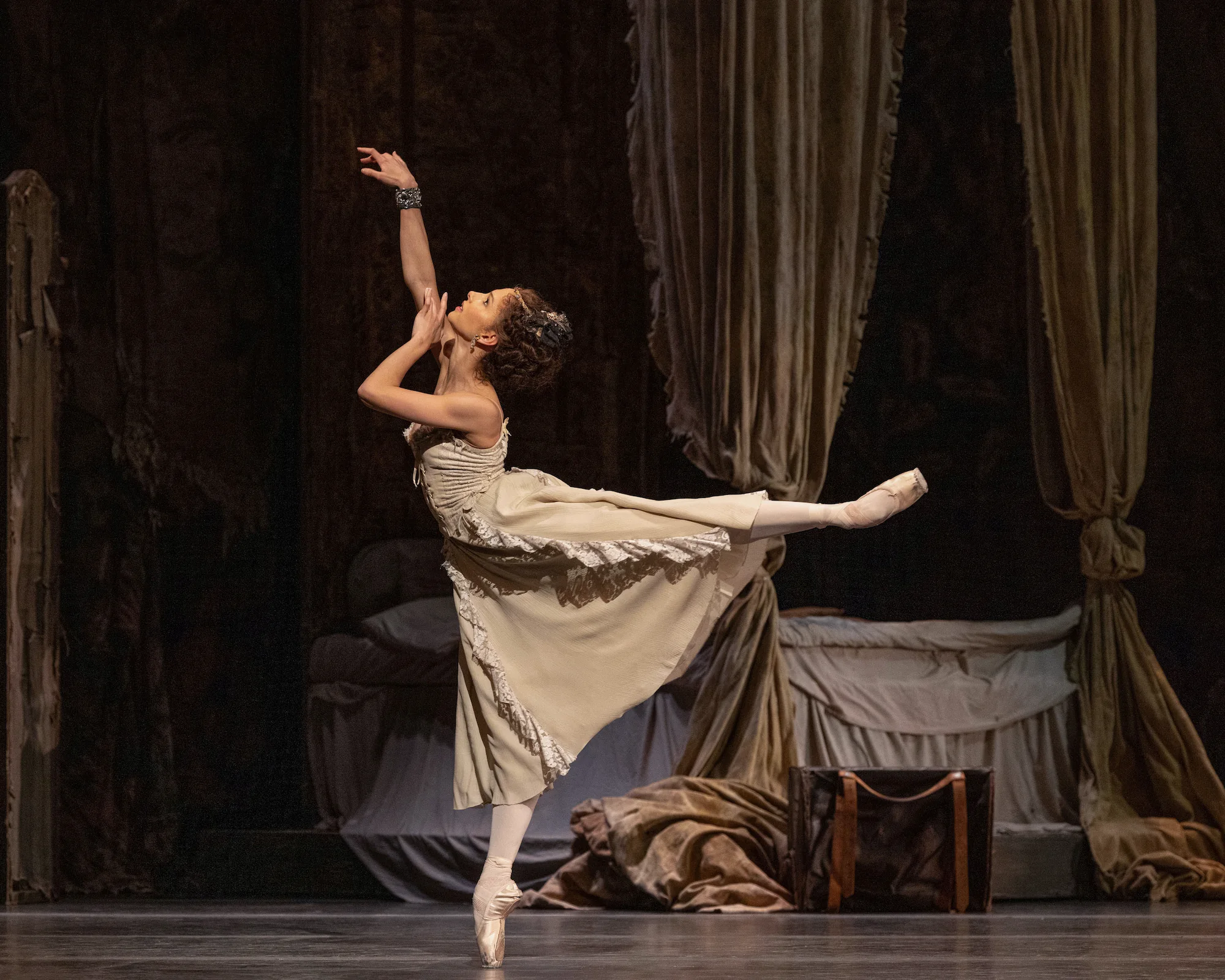 I find the presentation of Manonâs character on stage fascinating, as she seduces and manipulates the audience into forgiving her whims and misfortunes. I wanted to discover and capture the point in the ballet her emotions lift us beyond just feeling sorry for her to empathy. And this came in Act II, Scene 18 during a party at Madamâs house (a high class brothel) in Paris entitled âManon and her admirersâ. After a triumphant entry as Monsieur G.M.âs possession, she performs a seductive but strange solo with Des Grieux and Monsieur GM circling around her as the rest of the cast freeze, before she is lifted high and dispassionately passed from one man to another with one foot erect to make no mistake of Lescautâs legacy for her. For this choreographic representation of manipulation and abuse, Massenetâs usually lyrical score becomes chilling, making the audience feel uncomfortable.