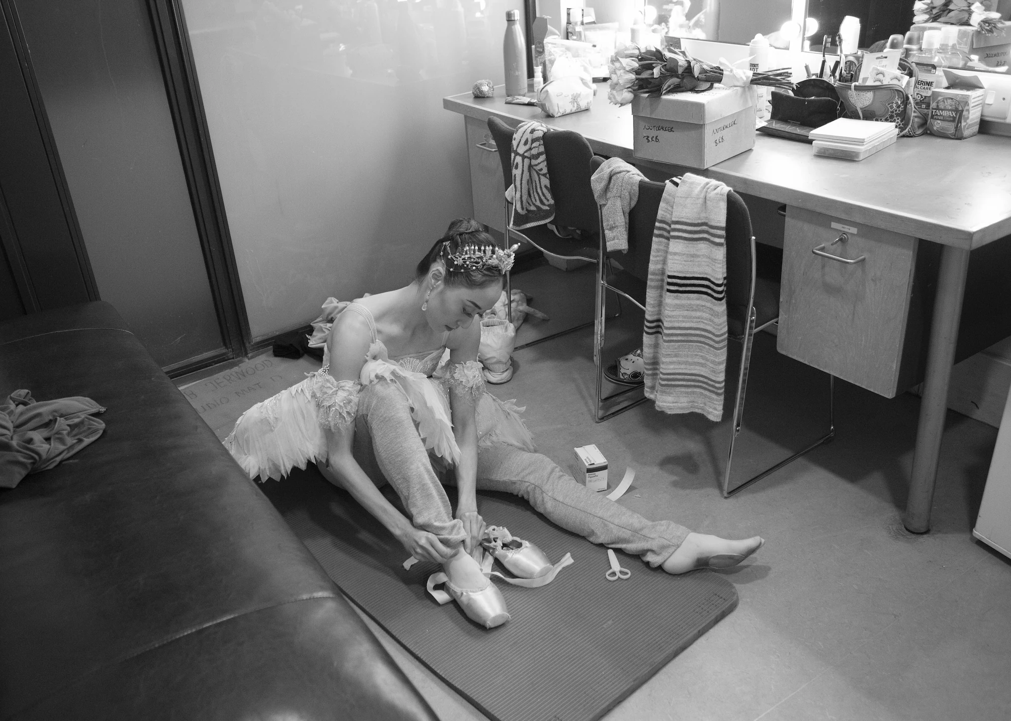 Dressing rooms can be very cramped, and it is a very personal way of photographing involving trust and intuition. Dancers can be nervous, follow certain rituals, and you need to know when to give them privacy and space. They need to get made up, do their hair, have costumes ready, warm up and stretch, and decide on which pointe shoes to dance in. All while keeping an eye on the television screen showing them the action on stage so they donât miss their entrances.
