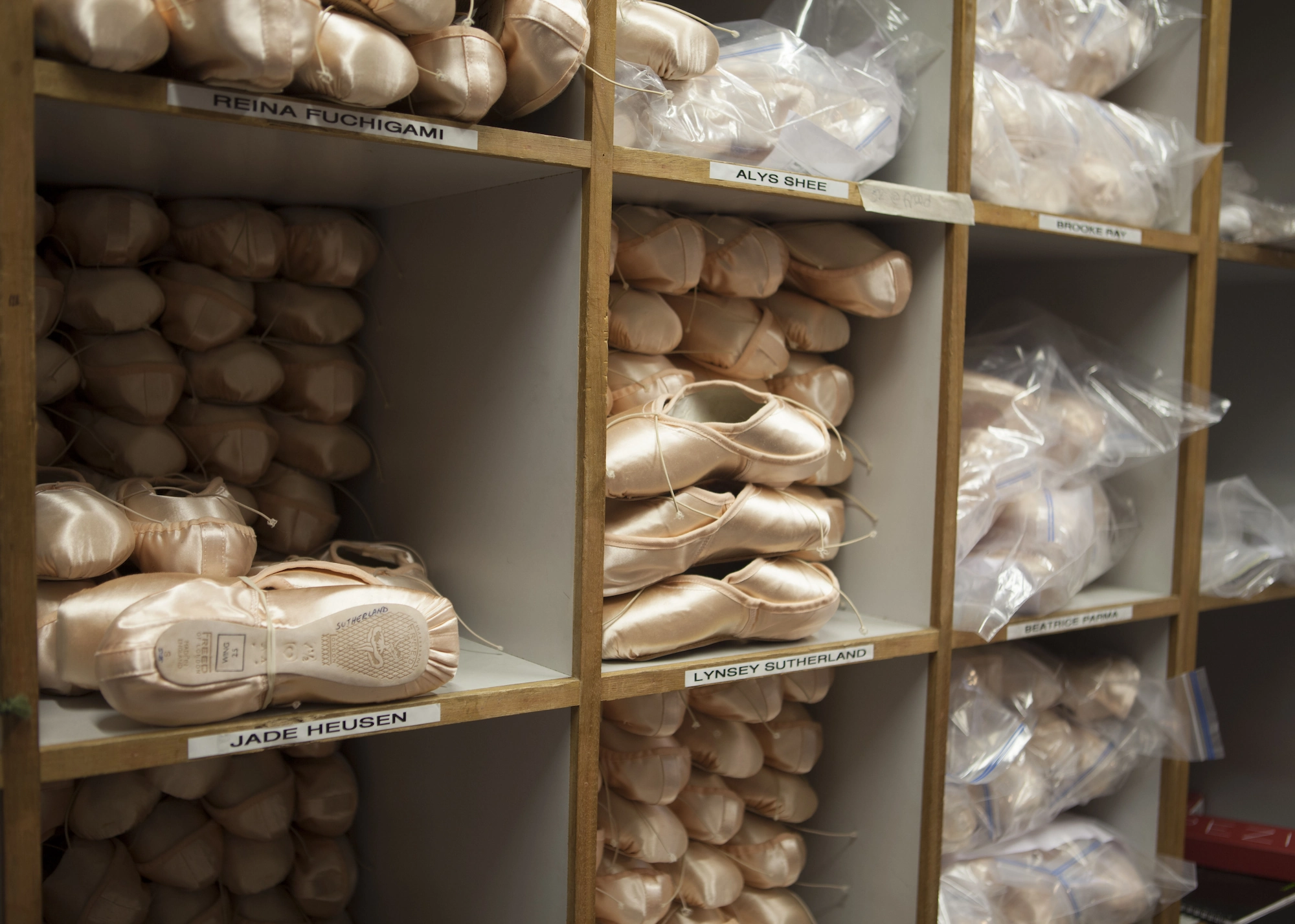 There was a wooden grid of boxes from floor to ceiling, where each dancer in the company had a named space for their shoes, with their surname written on the leather sole and special requirements.