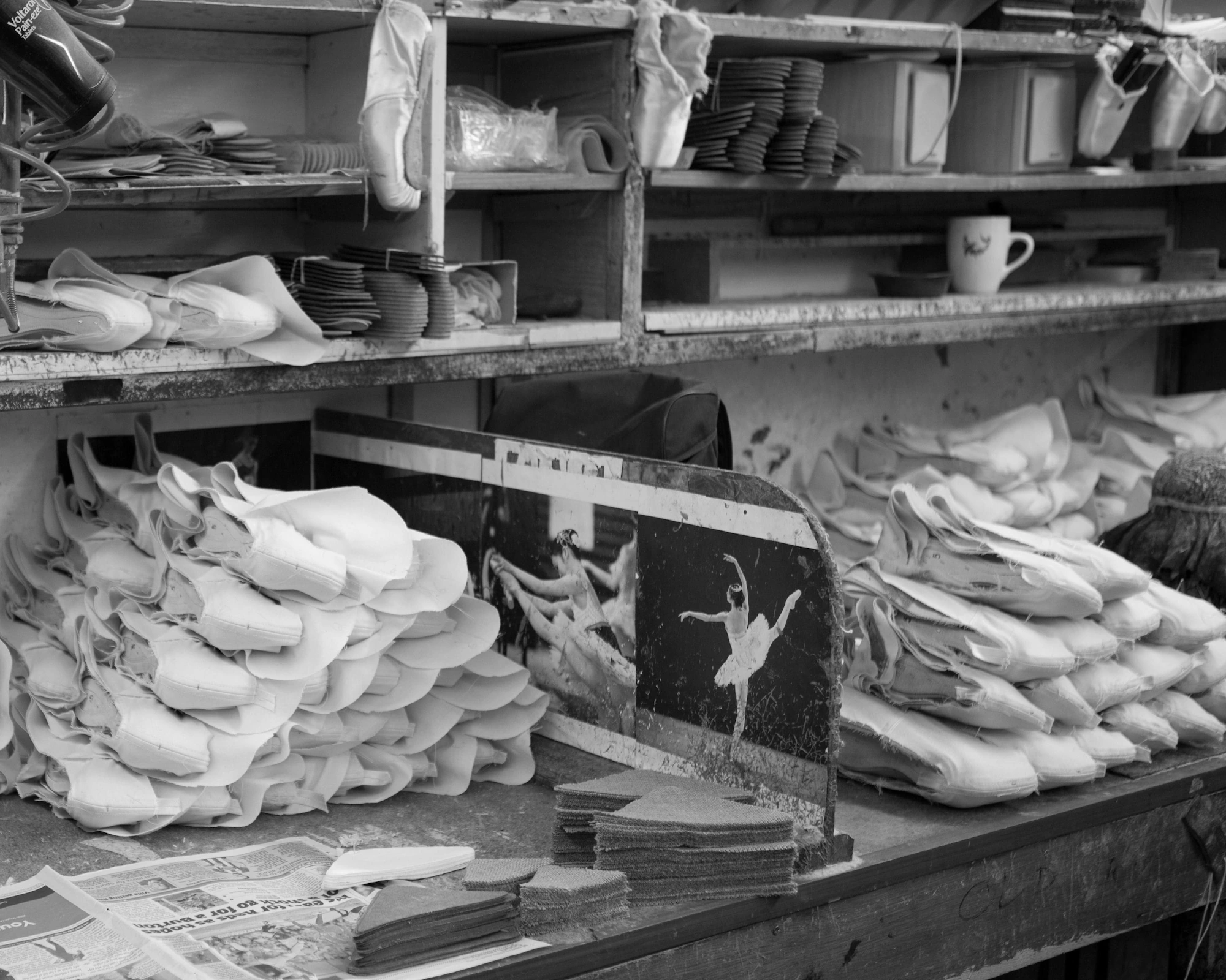 I had previously visited one of the Freed of London factories in Hackney in 2016, to photograph the different stages of making pointe shoes. Here I learnt how the satin fabric was pulled over a last, and using a combination of paste, hessians and cards they built up the block to support the dancerâs weight en pointe. I saw the leather soles stacked up and how each maker has their own mark â a crown, heart, Maltese cross. There were reels of ribbons and cord, ballet and football posters, and one maker even used a reject pointe shoe as a phone holder. Hardly any of the makers have been to the ballet and yet they create the crucial item that breathes beauty into this artform.