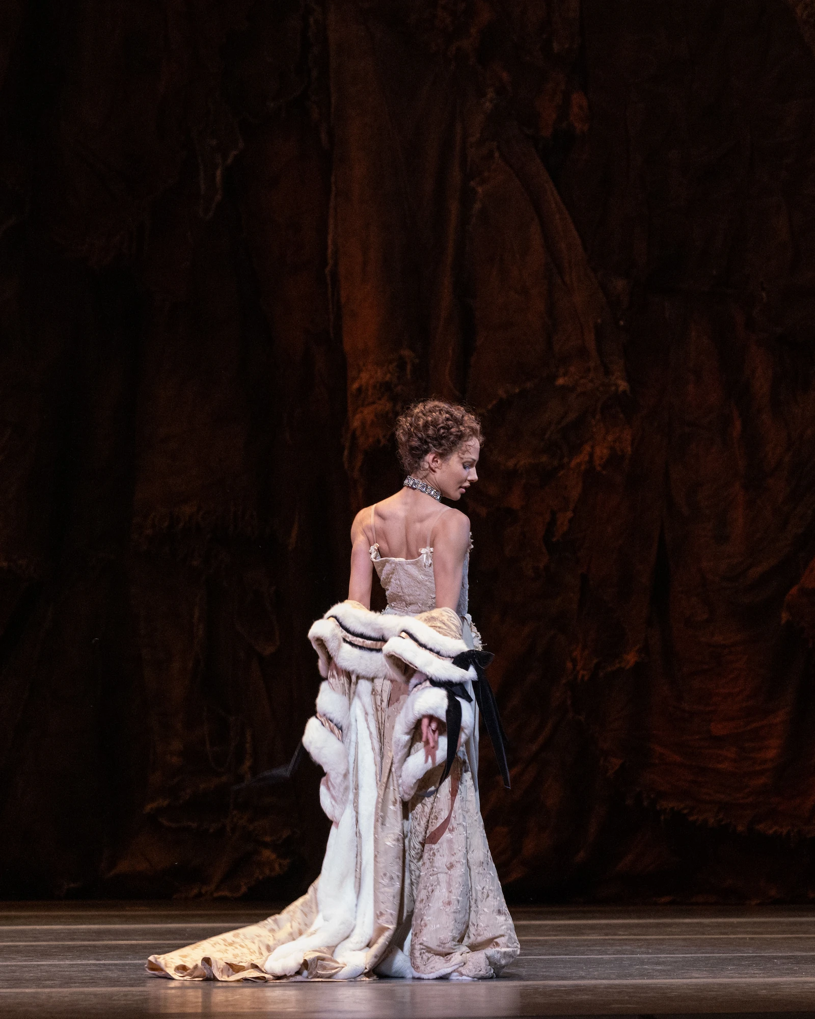 Manon makes her entrance wearing a fresh looking pale blue gown at the beginning of the ballet; alights from the bed in her second pas de deux in a pretty petticoat with bows on the straps and ruffles of fabric, followed by the heavy luxurious fur coat and jewels presented by Monsieur GM; to a sumptuous black lace gown embellished with silver for Act II covered at first by an overcoat intricately decorated with more than 200 hundred bows.