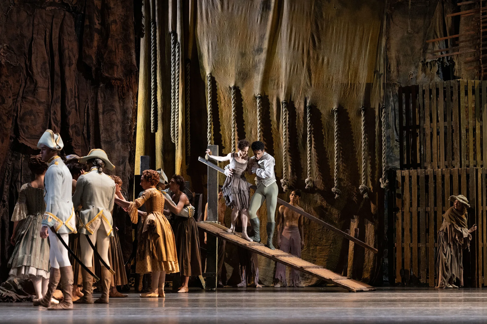 For Manon the costumes were often lavish, but the stench of poverty was to be ever present reflecting the precarious division between opulence and degradation. In the final act Manon disembarks from the convict ship distressed, in rags and her hair shorn.
