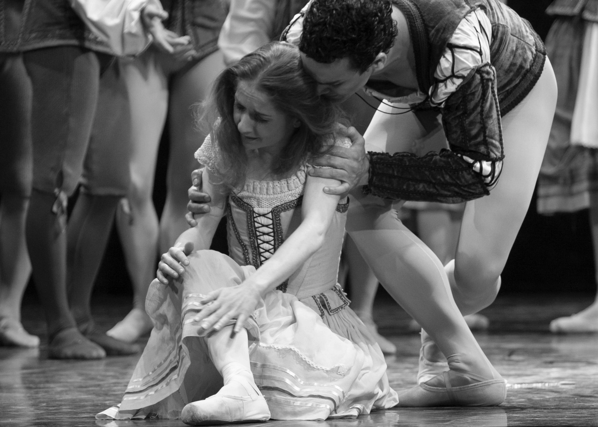 MacMillan based the narrative structure of Manon on his previous three act ballet of Romeo and Juliet, and you can see visual echoes of the couple meeting in a crowded scene, Des Grieux declaring his love in a solo to a seated Manon. Their love story is revealed though a series of pas de deux including one set on a bedroom, and in the swamp Des Grieux desperately attempts to keep an exhausted Manon alive in a way reminiscent of Romeoâs disbelief that Juliet is dead in her familyâs vault. The corps de balletâs ensemble dances provide the social context to the story.